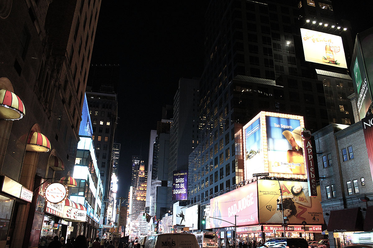 Times Square in New York! A lot of people are walking on the street in Time Squares at around 10PM. Most stores on the street are opened. It’s like alive and very active.